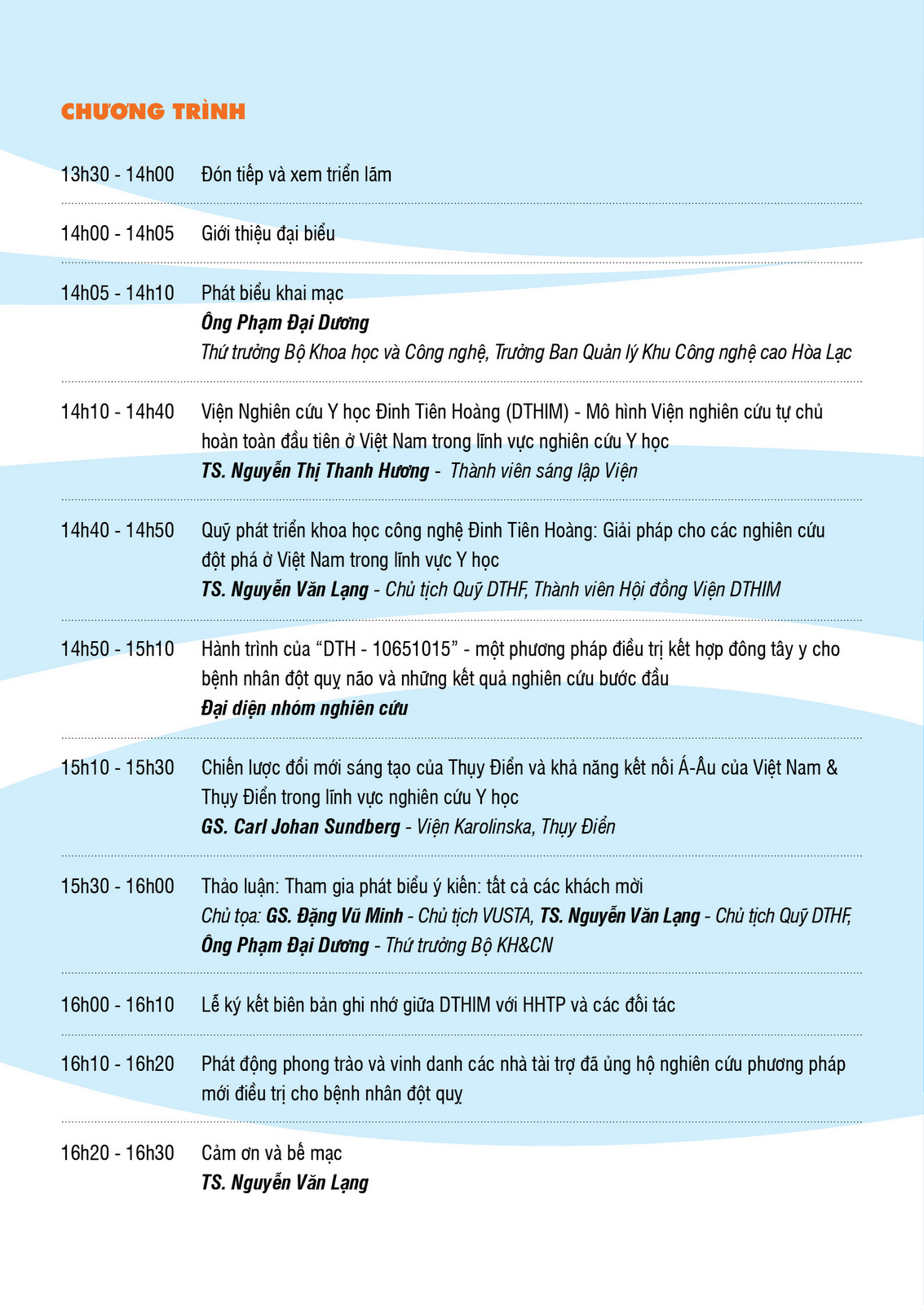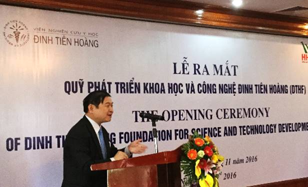 Quỹ Phát triển Khoa học & Công nghệ Đinh Tiên Hoàng (DTHF): sự kiện khởi đầu cho tiến trình xã hội hóa trong nghiên cứu Y học tại Việt Nam Chiều thứ năm ngày 03 tháng 11 năm 2016, Viện nghiên cứu Y học Đinh Tiên Hoàng đã phối hợp với Khu Công nghệ cao Hòa Lạc long trọng tổ chức Lễ ra mắt Quỹ Phát triển Khoa Học và Công nghệ Đinh Tiên Hoàng (DTHF) tại Khu Công Nghệ Cao Hoà Lạc. Nội dung của buổi lễ Tham dự buổi lễ có TS. Nguyễn Văn Lạng – Chủ tịch Quỹ Phát triển Khoa học & Công nghệ Đinh Tiên Hoàng (DTHF), Ông Phan Xuân Dũng – Chủ nhiệm Ủy Ban Khoa học, Công nghệ & Môi Trường của Quốc Hội, Ủy Viên Trung ương Đảng, GS. Đăng Vũ Minh – Chủ tịch Liên hiệp các hội khoa học kỹ thuật Việt Nam, Ông Phạm Đại Dương – Thứ trưởng Bộ Khoa học Công nghệ kiêm Trưởng Ban Quản lý Khu Công nghệ Cao Hoà Lạc, cùng toàn thể Ban lãnh đạo, Ban cố vấn của Viện Nghiên cứu Y học Đinh Tiên Hoàng, thành viên các Nhóm nghiên cứu, đại diện lãnh đạo, công chức, viên chức Khu Công nghệ cao Hòa Lạc, Trung tâm Ươm tạo Doanh nghiệp Công nghệ cao cũng có mặt đông đủ trong buổi lễ, và đặc biệt là có sự tham dự của các giáo sư cố vấn cao cấp người Thụy Điển và cả các bệnh nhân đã từng được điều trị bằng phương pháp DTH-10651015. DTH-10651015 là phương pháp điều trị Đông – Tây Y kết hợp do BS. Hà Việt Trung đã sử dụng điều trị thành công cho một số bệnh nhân mà các Bệnh viện lớn như Bệnh viện Bạch Mai, Bệnh viện Việt Đức đã trả bệnh nhân về nhà. Hiện nay, DTH-10651015 là một trong những trọng tâm quan trọng mà Viện đang tập trung nghiên cứu hoàn thiện qui trình điều trị cho một số các chứng bệnh nan y. Lễ ra mắt Quỹ phát triển Khoa học & Công nghệ Đinh Tiên Hoàng vừa đánh dấu mốc 4 năm hình thành và phát triển của Viện Nghiên cứu Y học Đinh Tiên Hoàng, nhưng đồng thời cũng khởi động quá trình kêu gọi tài trợ, kêu gọi đầu tư cho nghiên cứu Y học có tiềm năng đột phá của Viện. Số tiền vận động bước đầu trong buổi ra mắt Quỹ là ba trăm triệu đồng. Tuy chưa phải là một khoản tài chính lớn, nhưng sự kiện ra mắt Quỹ của Viện có thể được coi là sự kiện mở đầu cho quá trình xã hội hóa trong nghiên cứu khoa học ở Việt Nam.